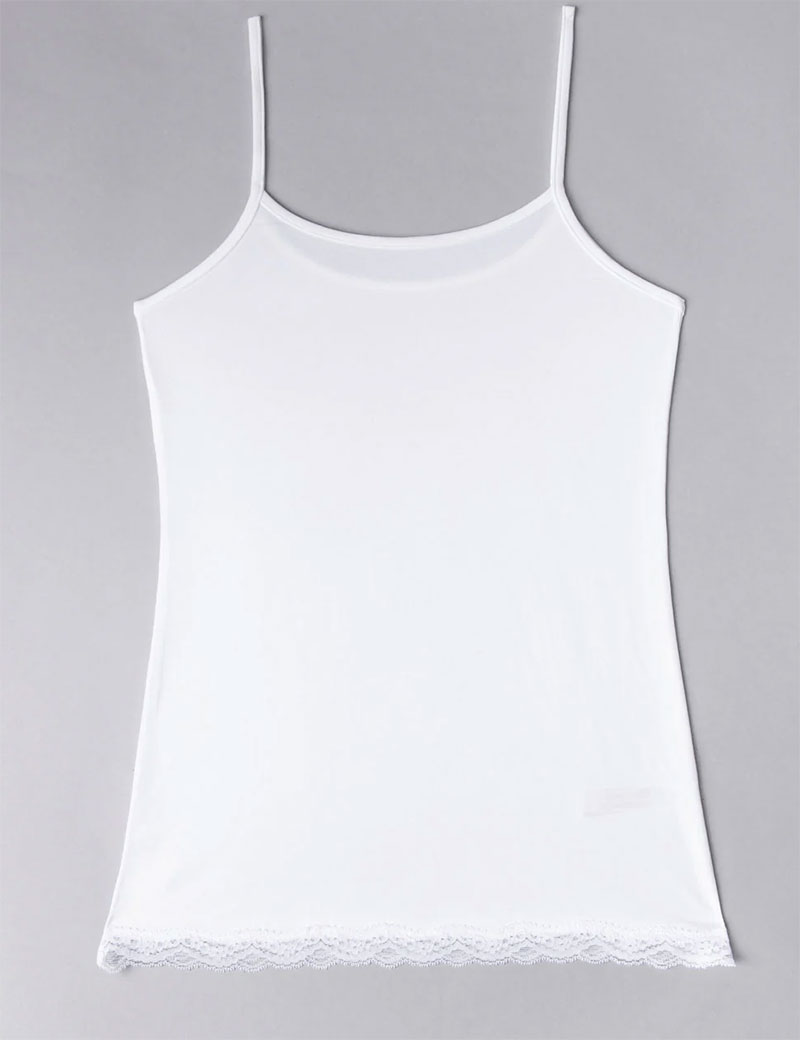 Белая женская майка на тонких бретельках Sielei модель NATURAL COTTON 1432, декорирована кружевом по подолу. Выполнена из мягкого и эластичного органического хлопка, собранного вручную, что обеспечивает высокое качество и комфорт. Может использоваться не только как нижнее белье, но и как верхний трикотаж, с джинсами и спортивными брюками.